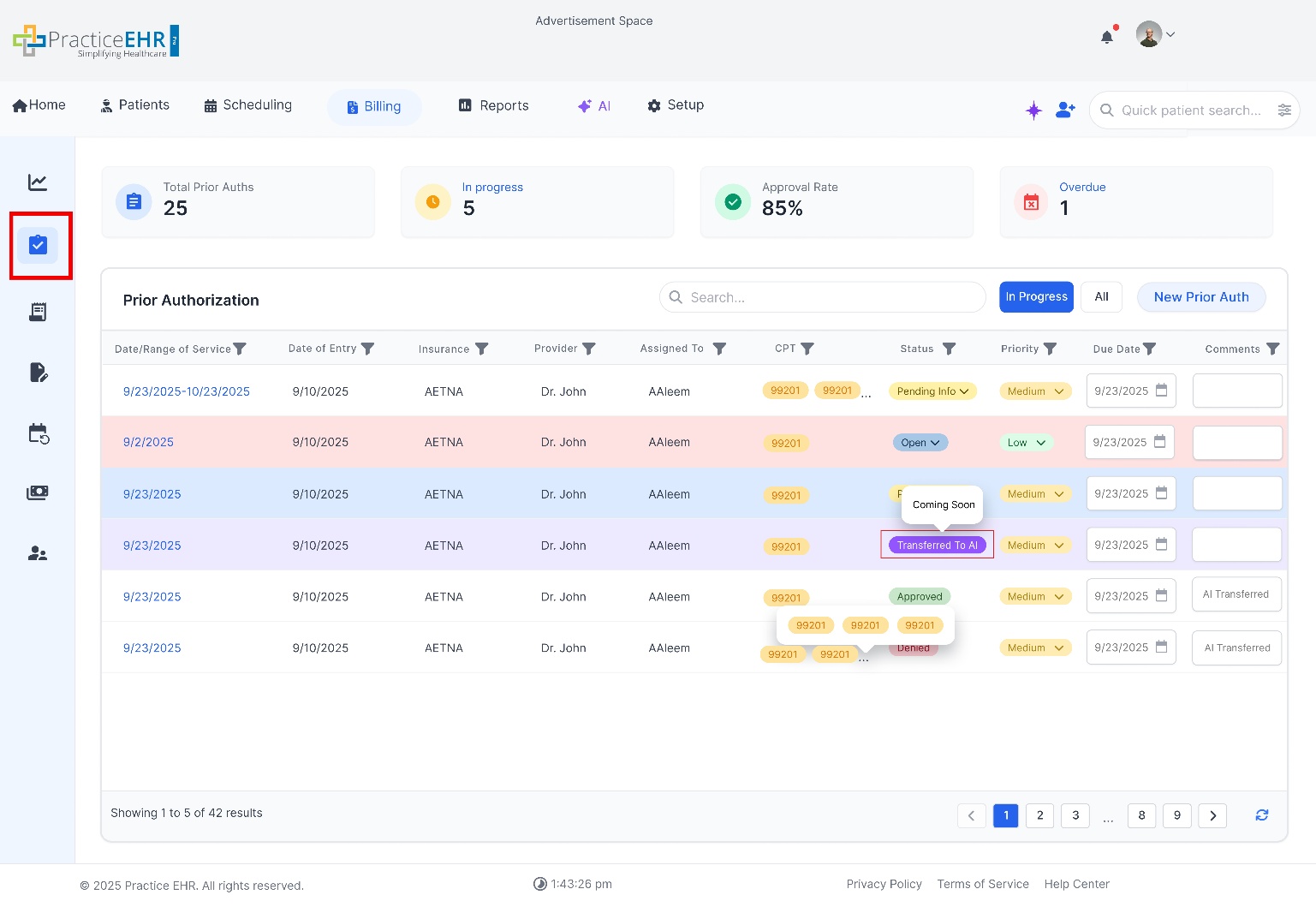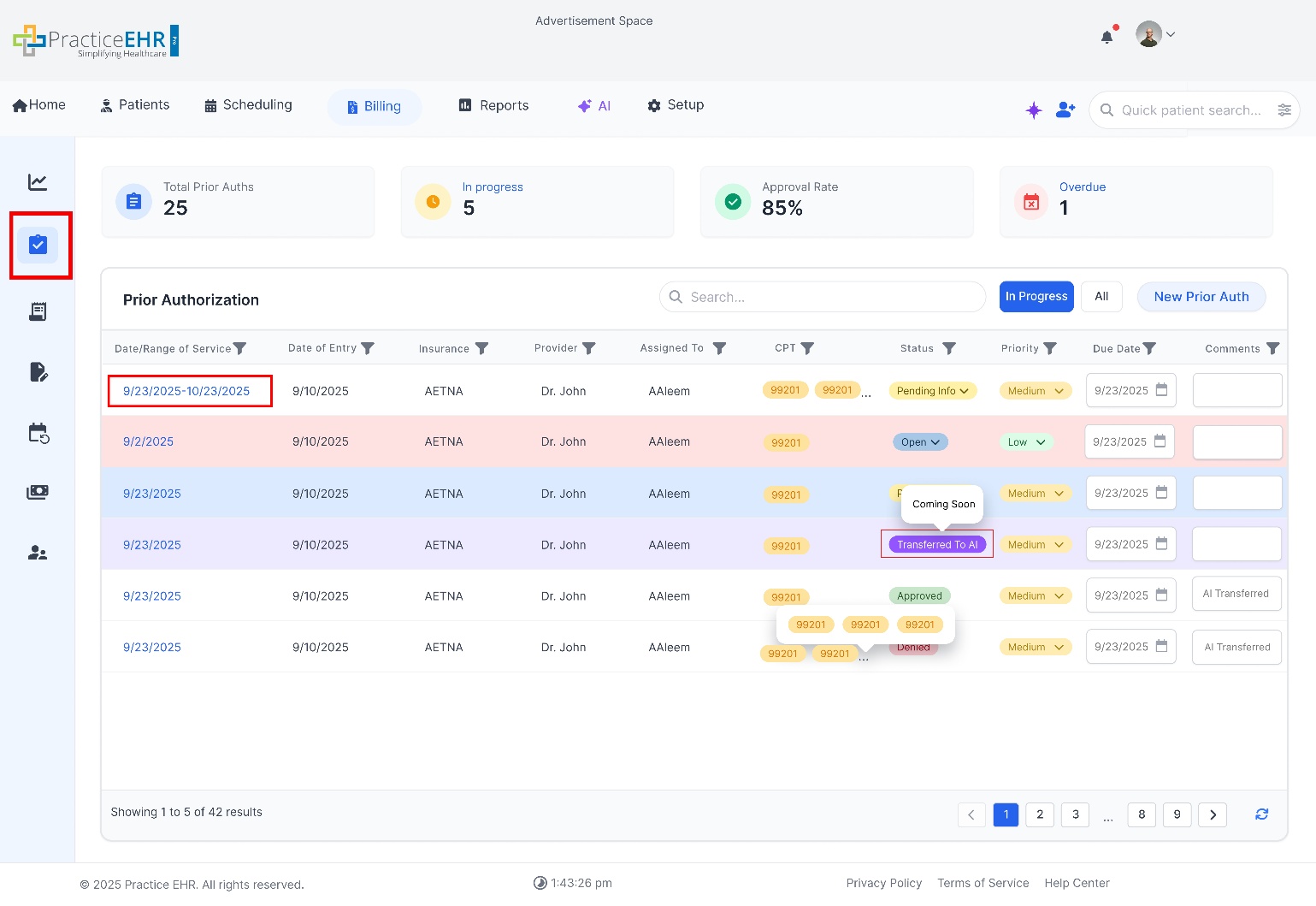 - The whole line item will be red if the prior auth is overdue. The status and priority can be changed directly from the grid using the provided dropdowns.